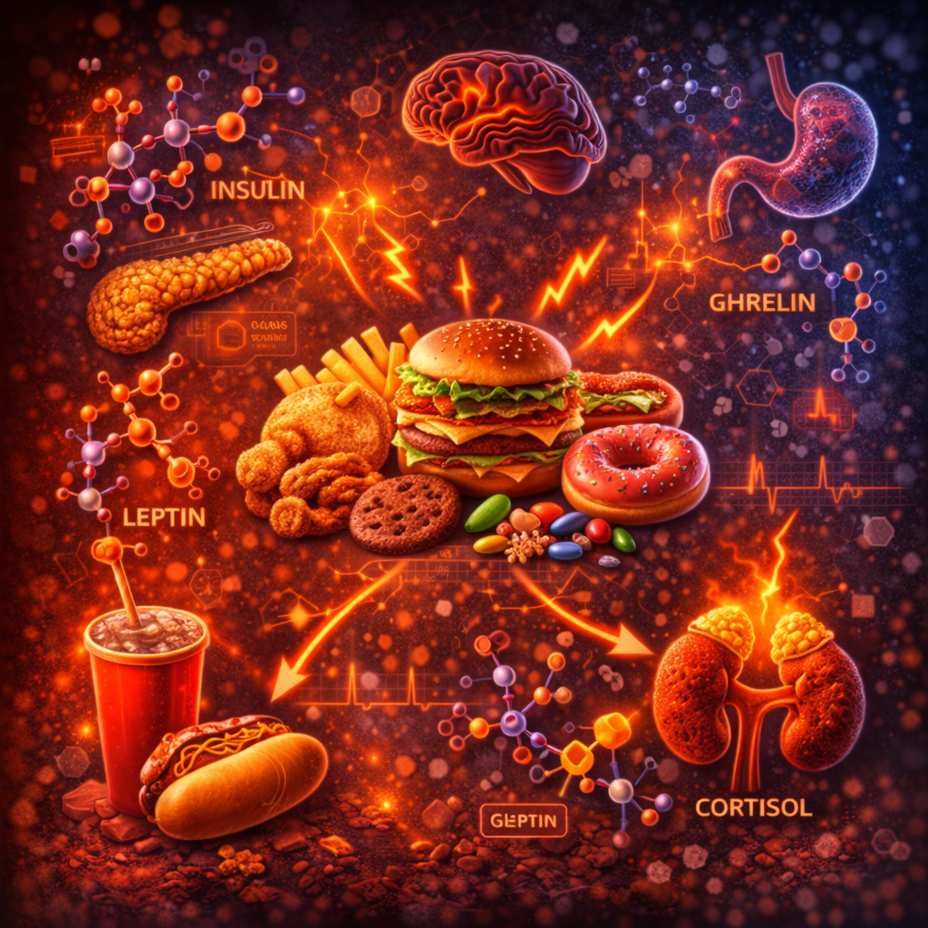 Ultra-processed foods create an endocrine environment characterized by high insulin, blunted leptin signaling, elevated cortisol, and persistent appetite stimulation. This combination accelerates metabolic decline.