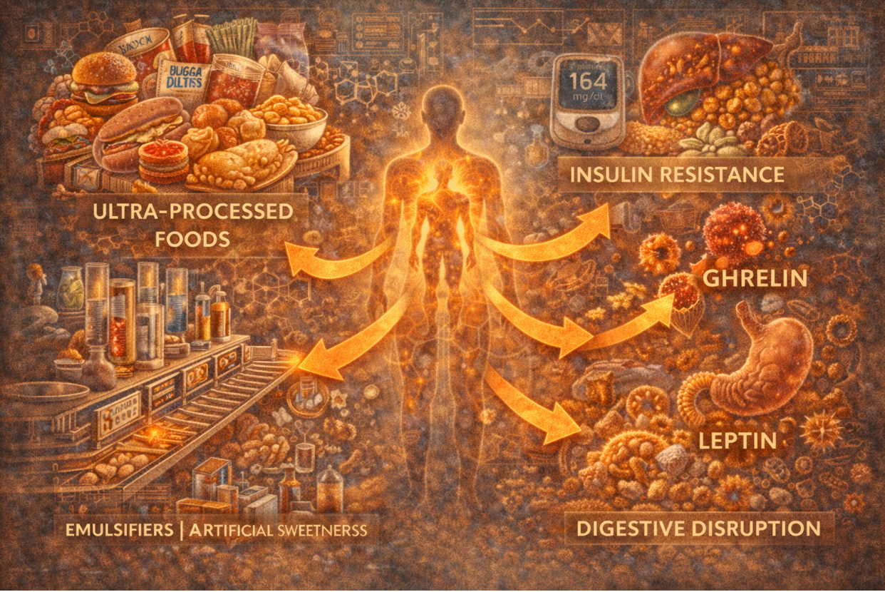 Ultra-processed foods create an endocrine environment characterized by high insulin, blunted leptin signaling, elevated cortisol, and persistent appetite stimulation. This combination accelerates metabolic decline.